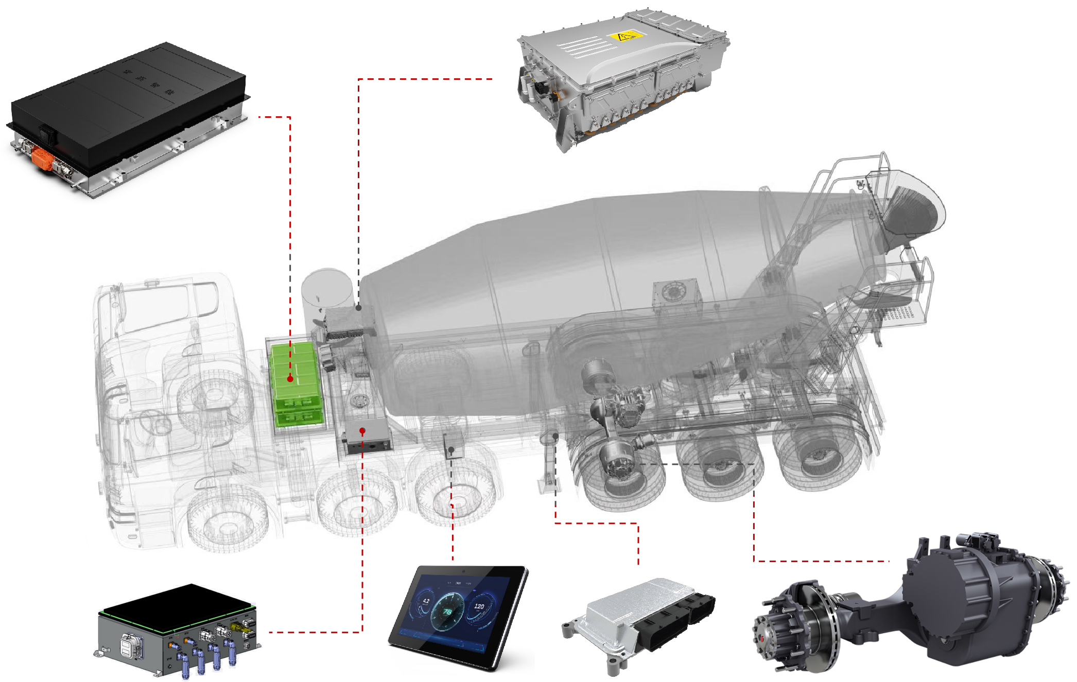展会上,南宫ng28智能的智电一体化解决方案引起了广泛关注。工程师团队在现场为参展观众详细介绍了混合动力牵引搅拌半挂车的系统方案。该方案基于南宫ng28智能历经多年开发的eMagi智电平台,针对牵引搅拌半挂车进行了定向开发,涵盖以下几个方面: